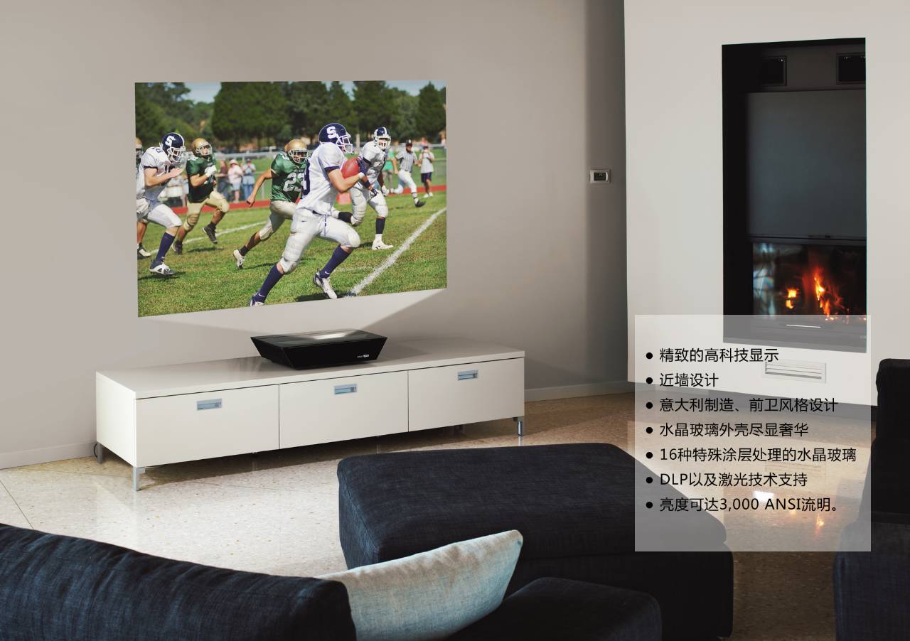 SIM2xTV兼容了最精致的显示装置以及令人兴奋的大屏幕显示效果。可安置于靠近墙面、屏幕甚至是任何浅色平坦的平面附近,并且能够极为清晰的展示出您所钟爱的影片画面的细节部分,让您完全沉浸于影片之中。